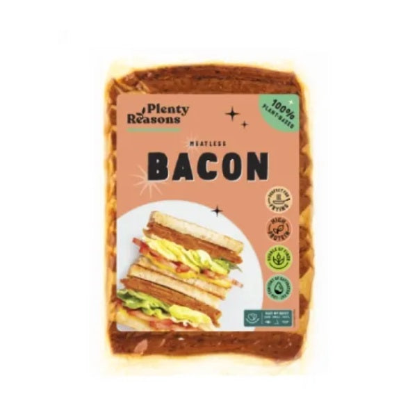 Plenty Reasons Bacon is a fantastic vegan meat alternative that is slightly salty, a bit peppery and distinctly smoked. We love the delightful texture that is elastic but not chewy, making it a great addition to many meals.
